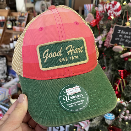 Ladies fit, featuring classic pink and green colors and a vintage green GOOD HART patch. Mesh bask, classic trucker.